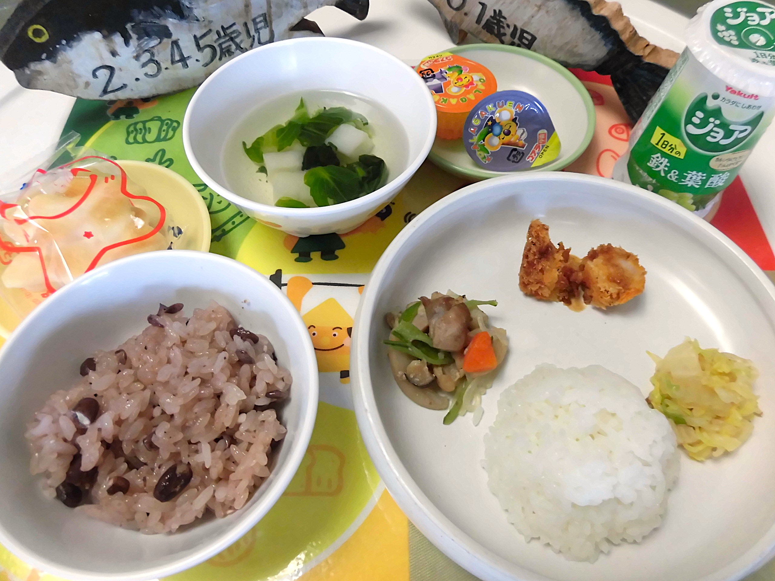 4月1日は入園式・進級式。新しいお友だちと一緒の新年度が始まりました。日常の保育風景は後日アップしますのでお楽しみに!新年度はじめの給食は赤飯(3歳以上)、海老フライ、筑前煮、白菜のおひたし、すまし汁、ミニゼリーでした。画像右側は2歳児クラスの給食です。栄養バランスや嗜好を考慮した美味しい給食を心がけています。今年度もどうぞよろしくお願いいたします。